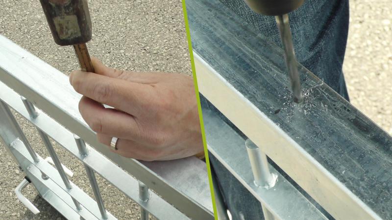 Ist das Maß einmal ermittelt, wird das Tor ausgehängt und die Position auf die Unterseite übertragen. Danach wird der Rahmen mit einem 6 mm Metallbohrer vollständig durchbohrt. Die Bohrung sollte dabei gerade durch den Rahmen verlaufen. Die Unterseite wird im Anschluss mit dem Stufenbohrer soweit aufgebohrt, dass der 10mm Steckschlüssel Platz findet.