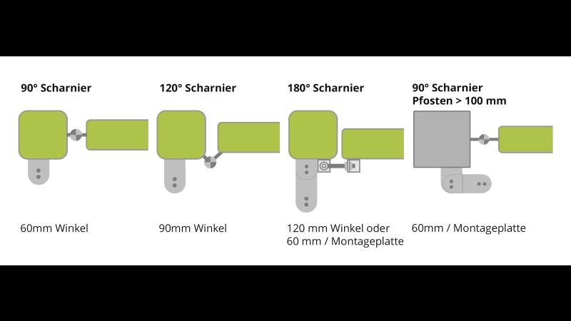 | Montagewinkel Pfosten/Wand | 60mm, 90mm oder 120mm | 80mm oder 120mm |
